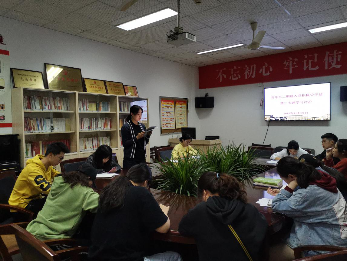 10月21日晚,音乐系第二期入党积极分子培养班在系党员之家活动室举行第三次专题学习讨论,围绕不忘初心,牢记使命,查摆不足,诠释入党动机”进行交流。