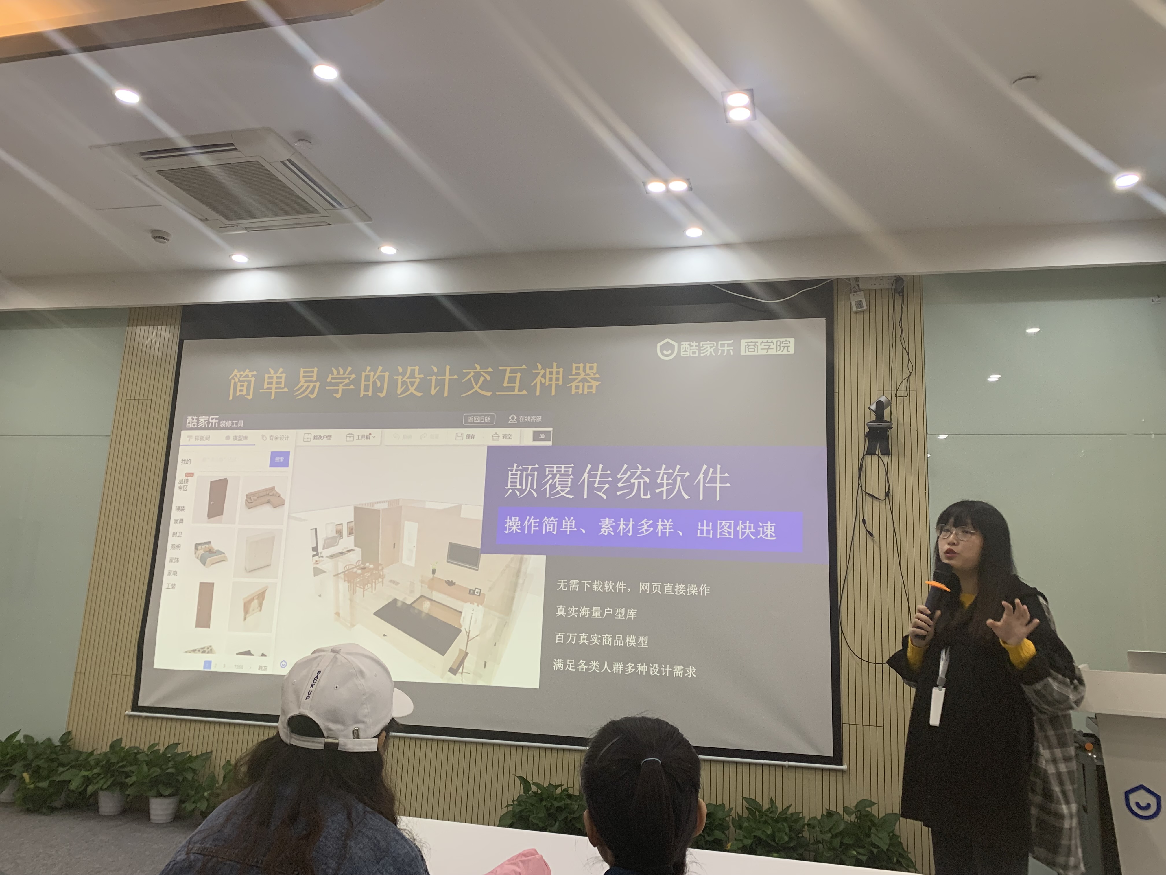 杭州群核信息技术有限公司酷家乐商学院钱老师为17环艺班授课,授课主题为《科技赋能 打造未来设计新生态》。钱老师介绍,酷家乐云平台是以分布式并行计算和多媒体数据挖掘为技术核心推出的VR智能室内设计平台。通过ExaCloud云渲染技术,云设计、BIM、VR、AR、AI等技术的研发,10秒生成效果图,5分钟生成装修方案。酷家乐用户可以通过电脑在线完成户型搜索、绘制、改造,拖拽模型进行室内设计,快速渲染预见装修效果。目前,平台拥有覆盖全国90%的户型库,吸引了超过300万室内设计师(覆盖全国40%的室内设计师)和超1000万业主用户。酷家乐已服务于小米、美克美家、林氏木业、顾家家居、博洛尼等12000家品牌企业,市场覆盖率超过70%。