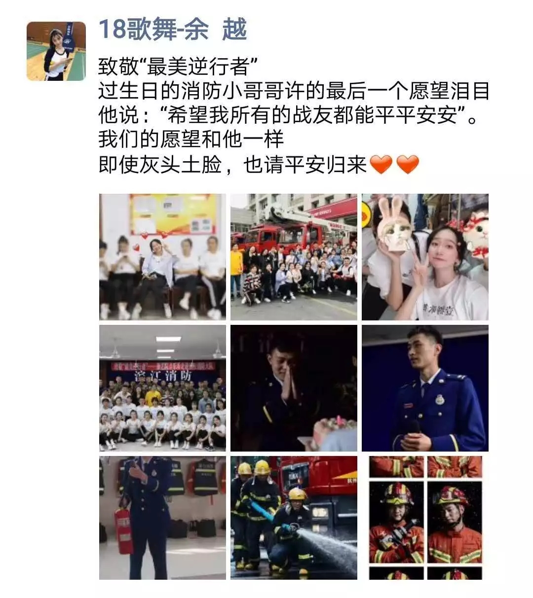 活动结束归来时,志愿小分队队员们纷纷在自己的朋友圈发出了感想和祝福。队员余越说,今天感受最深的就是过生日的消防小哥哥许的最后一个愿望,眼含热泪的他说“希望所有的战友都能平平安安”,我们的愿望和他一样,即使灰头土脸,也请平安归来。队员周祺说,愿所有为祖国奉献的战士们平平安安,我也为自己生活在这个英雄辈出的时代而感到自豪。