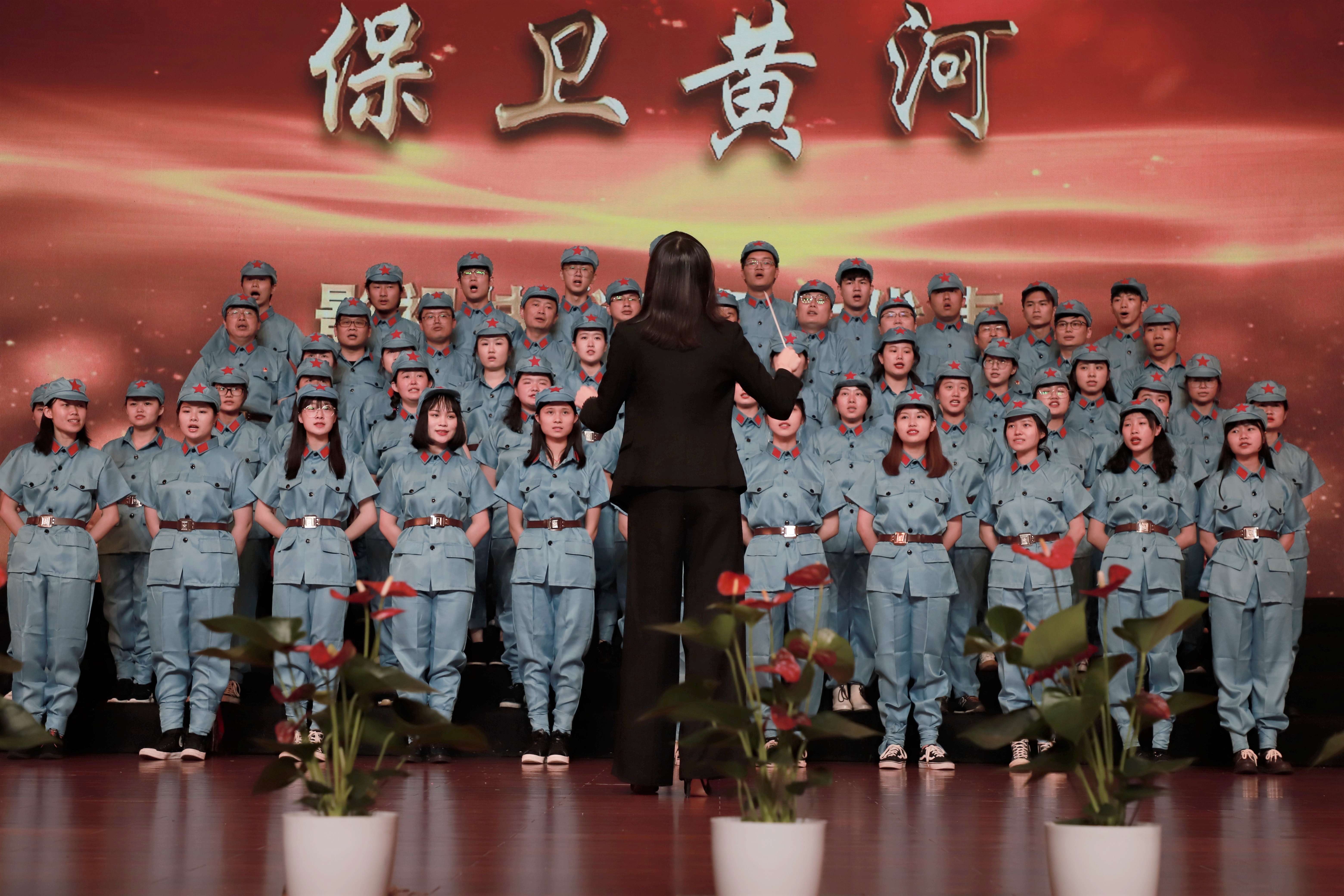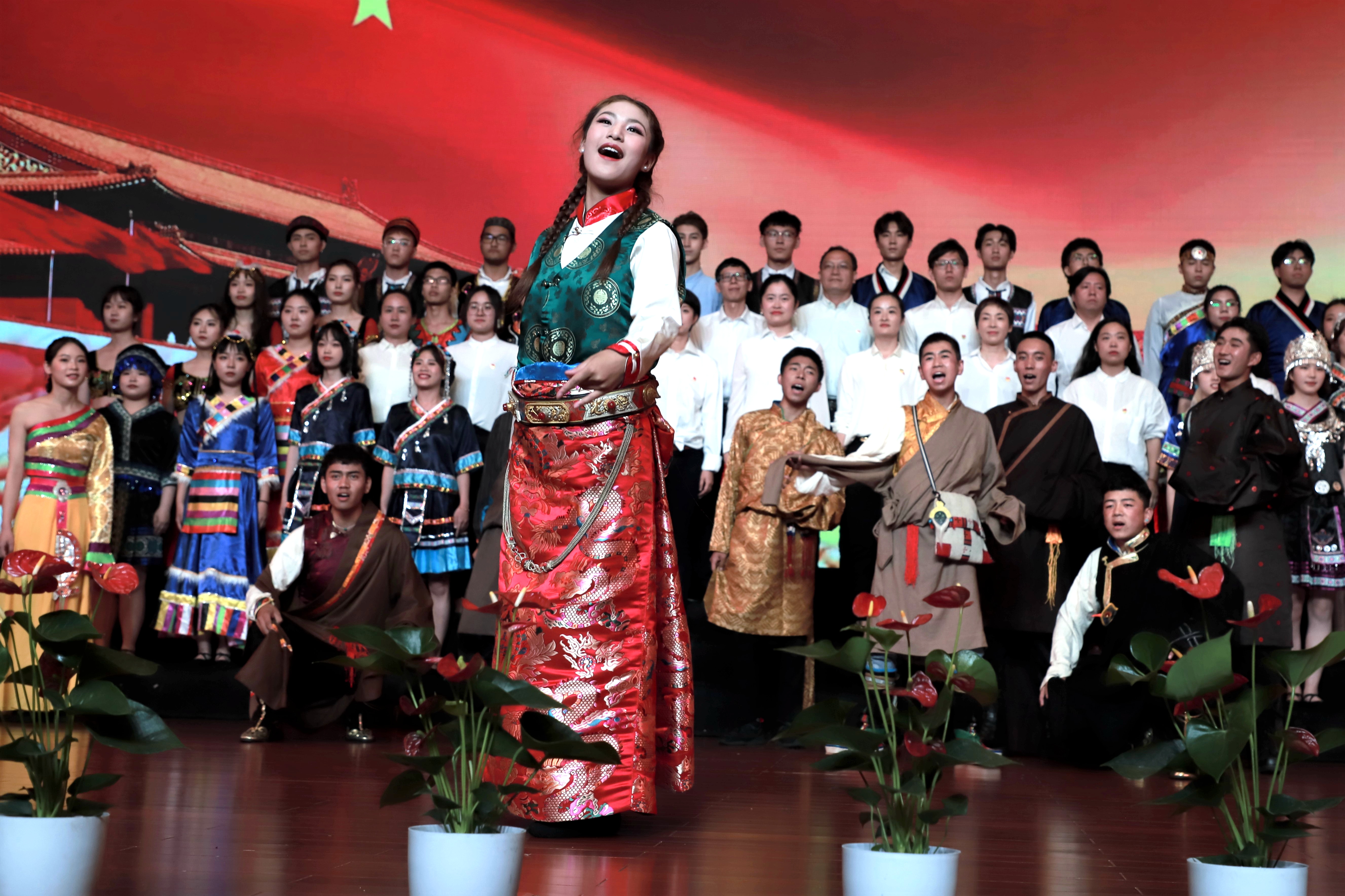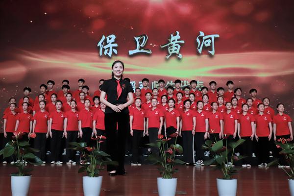音乐系的百人合唱团阵容强大,《在灿烂的阳光下》有领唱、合唱、朗诵、乐器演奏和舞蹈等多种表现形式,台上台下呼应,慷慨激昂的歌声获得如雷般掌声。舞蹈系合唱团和影视技术系合唱团分别演唱了《保卫黄河》,各具特色,舞蹈系的红绸舞为这首歌增添了刚劲有力的气概,影视技术系的军装演出服整齐干练,两支队伍歌声嘹亮,表达了对黄河、对祖国母亲炙热的感情。“五十六个星座,五十六枝花,五十六族兄弟姐妹是一家”美术系合唱团带来的《爱我中华》,由全体党员教师和学生代表共同演唱,近年来我校积极响应教育部关于内地高校招录少数民族学生的相关政策要求,每年都录取一定比例的少数民族学生,表演的学生中有少数民族学生代表,他们用载歌载舞的形式表达中华儿女一家亲。
