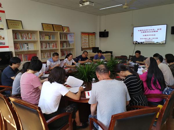 各党支部书记传达学习“不忘初心、牢记使命”主题教育第一批总结暨第二批部署会议精神、第二批“不忘初心、牢记使命”主题教育指导意见以及全省“不忘初心、牢记使命”主题教育第一批总结暨第二批部署会议精神。主题党日现场全体党员继续深入学习了学校主题教育工作会议内容和精神,学习习近平总书记在“不忘初心、牢记使命”主题教育工作会议上的讲话精神,学习“不忘初心,牢记使命”主题教育名词解释,并就近一段时间学习教育的主要任务做了明确。与会党员认真学习了文件精神,集体自学并将按要求分头通读《中国共产党章程》和《习近平关于“不忘初心、牢记使命”论述摘编》。党总支书记高澄明、党总支专职副书记谢志勇分别就学习教育要求在各党支部做了明确。