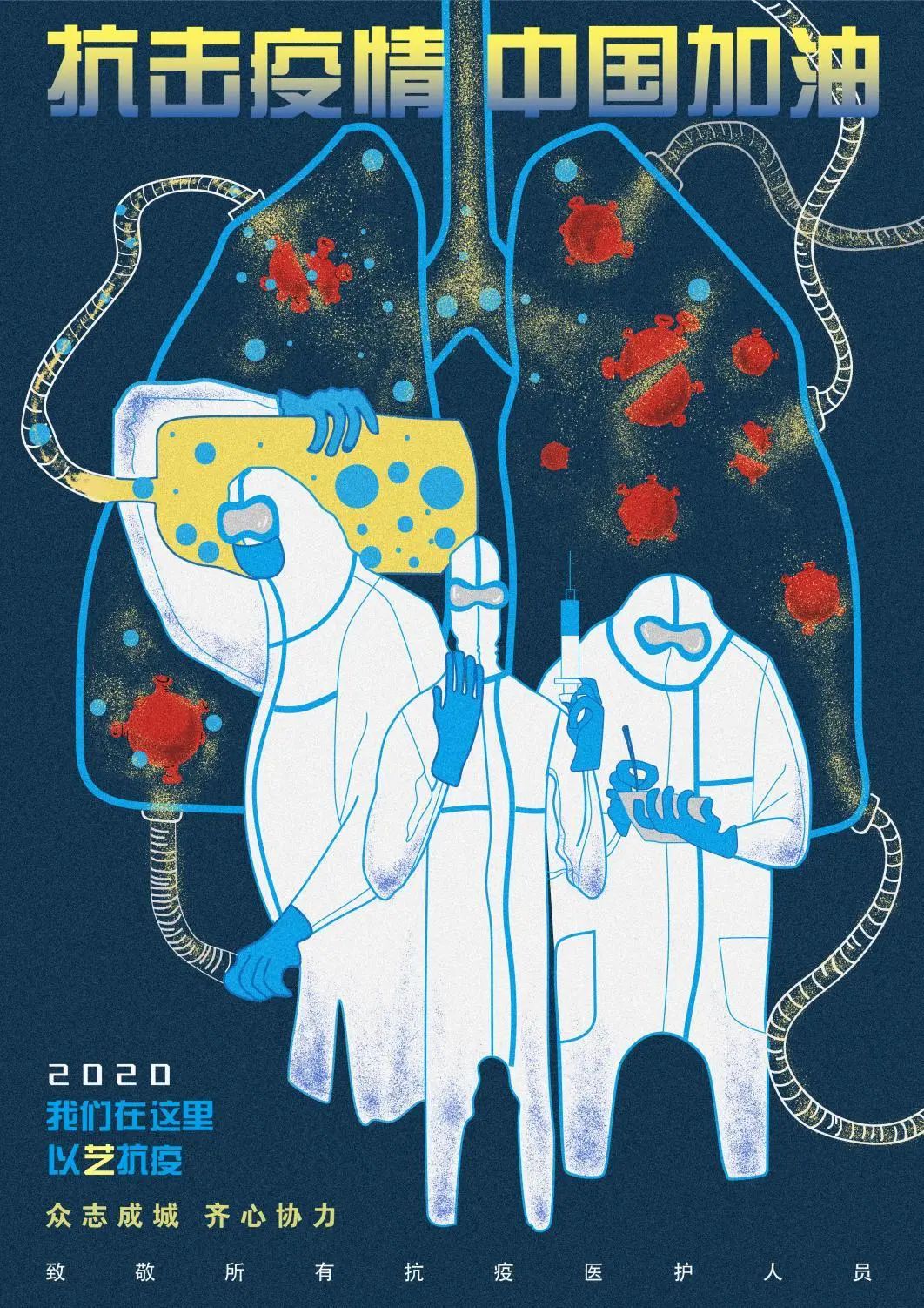 18广告设计与制作班梁天怡的作品《抗击疫情 中国加油》,则展现了抗疫一线医护人员的艰辛瞬间,她的创作灵感来源于疫情期间网络上报道很多有关医护人员在一线战“疫”的感人事迹,于是在设计中就将他们在一线与病毒抗争的的情景,结合进海报中。