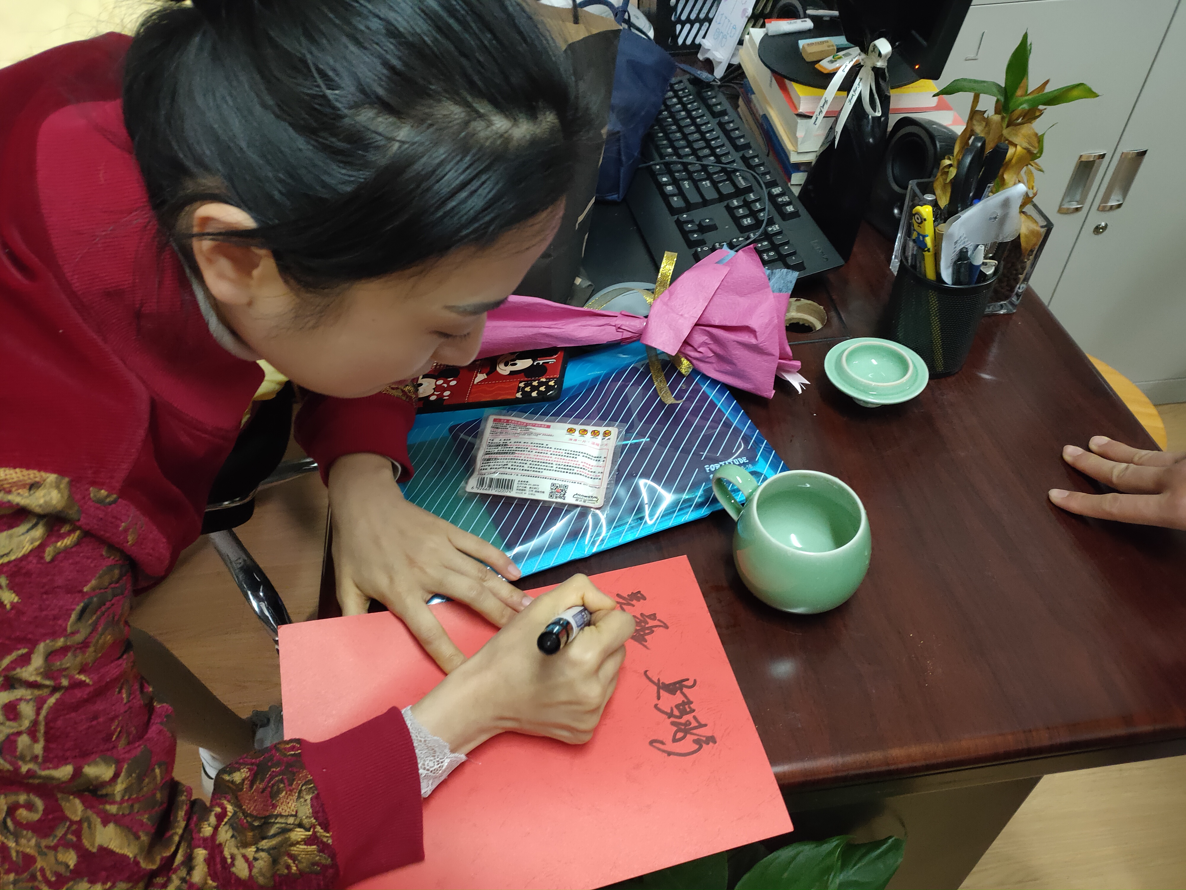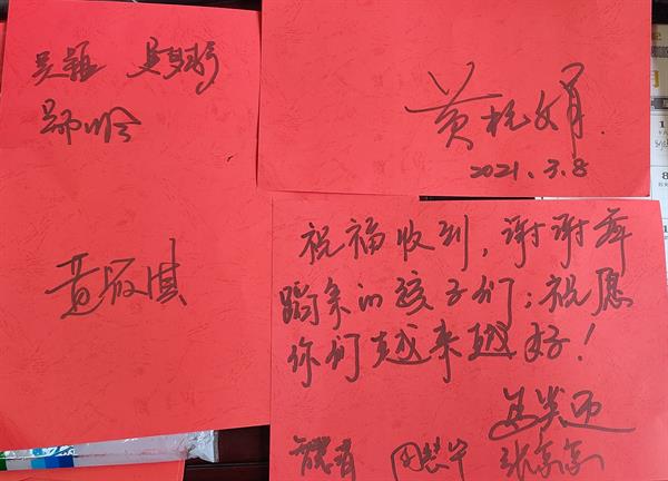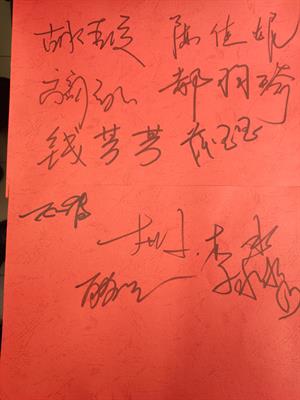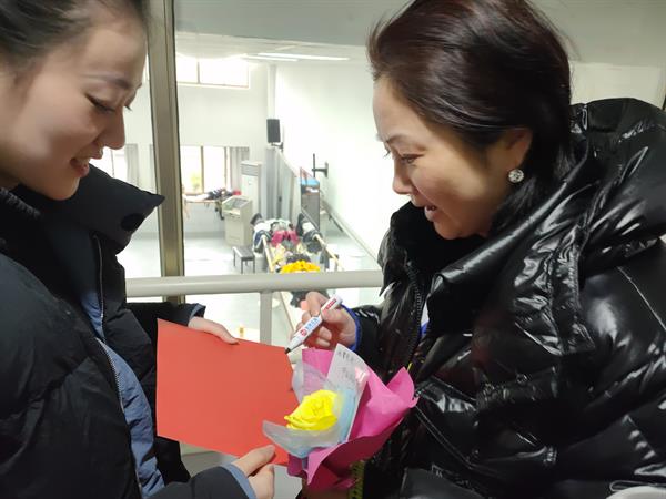 38日清晨,同学们将一朵朵五颜六色的花束献给平日里辛勤浇灌艺术之花的老师们,这是一种爱的回馈。老师们接过“鲜花”,露出开心的笑容,她们在签名簿上签字,留下了温暖的印记。