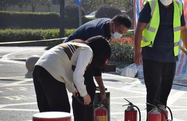 消防宣传员详细介绍了手提式干粉灭火器的使用方法,并做现场演示:拔出插销,按下把手,在距火源1.5至2米的安全距离内,瞄准火源根部,喷出粉尘。