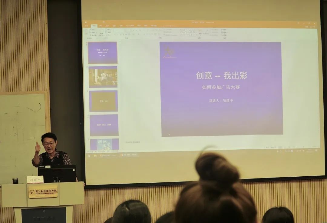 创作离不开生活。项建中表示,生活中任何小细节都可能迸发出无限灵感。项建中教授主要从“什么是创意”“广告创意的内涵”等诸多方面为同学们作了详细的讲解。在近三个小时的讲座中,项教授多次引用获得金奖的广告作品,从广告的艺术性内涵延伸开来,剖析广告是如何让大家平时的生活与艺术产生联系,在与观众的共鸣中达到直击人心的震撼。他指出“广告也是一门艺术,它的创造同样离不开想象和联想,离开想象和联想,广告创意寸步难行”。