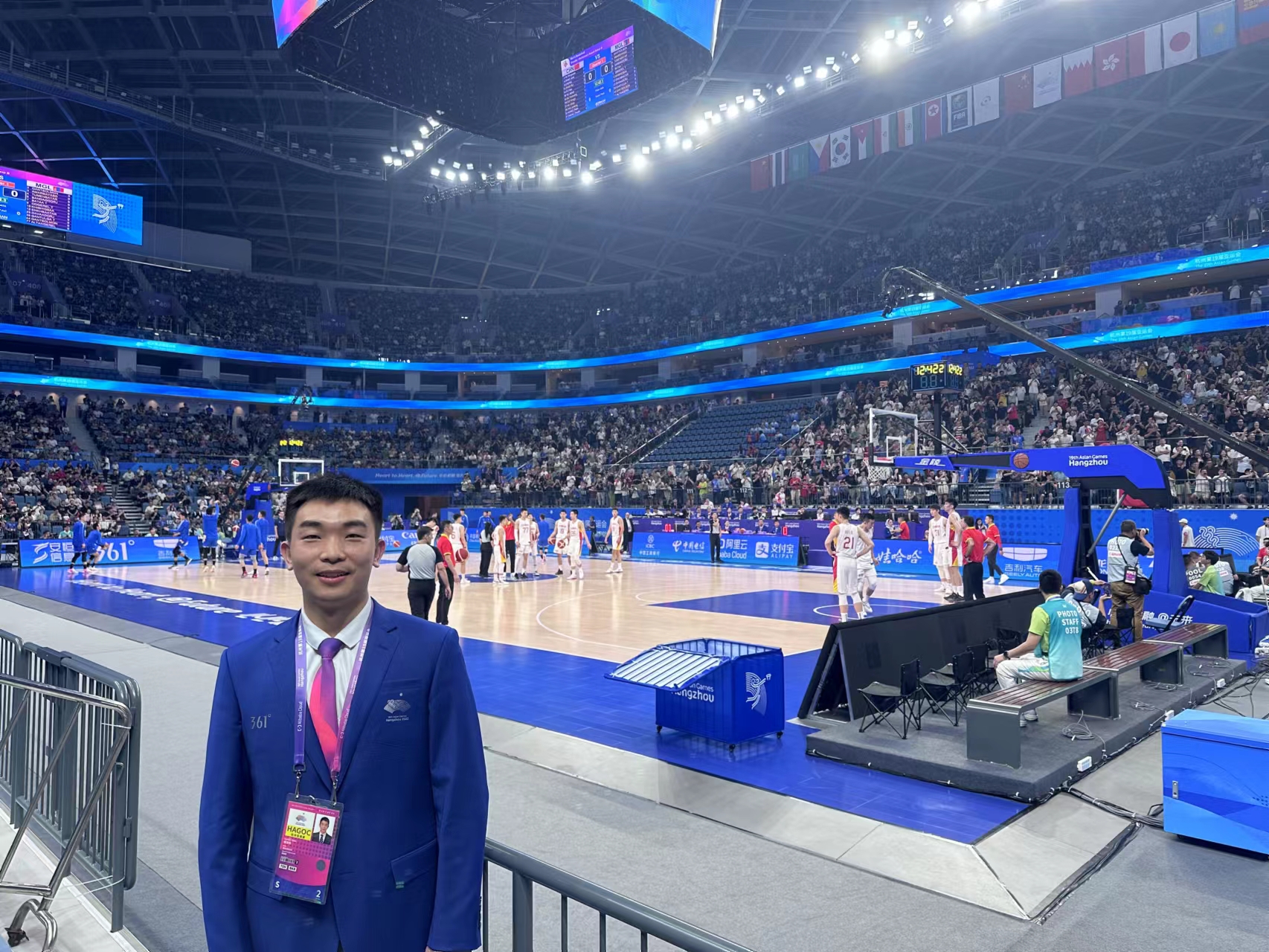 经过国家体育总局篮球管理中心和浙江省篮球协会的层层选拔、多轮培训指导、亚运测试赛筛选和考试,最终我有幸担任杭州第19届亚运会五人制篮球技术官员。本届亚运会五人制篮球项目比赛期间,我主要承担记录员和IRS即时回放工作,认真严谨地记录比赛过程中的数据,同时辅助临场执裁的国际技术官员回看争议判罚视频片段。担任亚运会国内技术官员是无上光荣和幸运的,但同时也承担了很大的工作压力,因为我们代表的是中国技术官员的业务水平,维护的是国家体育人的形象。亚运会国内技术官员工作已经顺利完成,我会把认真、严谨、追求“零失误”的工作作风带回学校的体育教学工作中,正如我在朋友圈发布的动态中所说“脚下路、继续迈”。