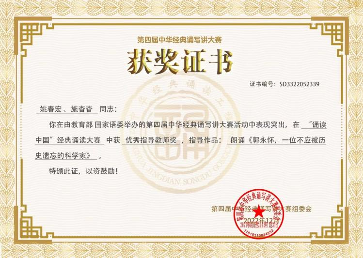 我校进入总决赛线上比拼的团队由2020级戏剧影视表演专业学生屠熠昼、翁嘉怡组成。决赛当天,戏剧影视学院发挥综合优势,戏剧影视学院专任教师孙国虎团队前期反复调试保障了比赛当天摄录技术的稳定性,同时在设计学院专任教师叶文志和教学实践中心老师们的大力支持和通力配合下,参赛选手淋漓尽致地展现了赛前抽签作品余光中的《当我死时》,他们用声音绘画,用语言表达,声情并茂的朗诵得到评委会的一致认可,以总决赛平均分91.972分(职业院校学生组第一名)和提交视频作品综合成绩获得职业院校学生组一等奖。