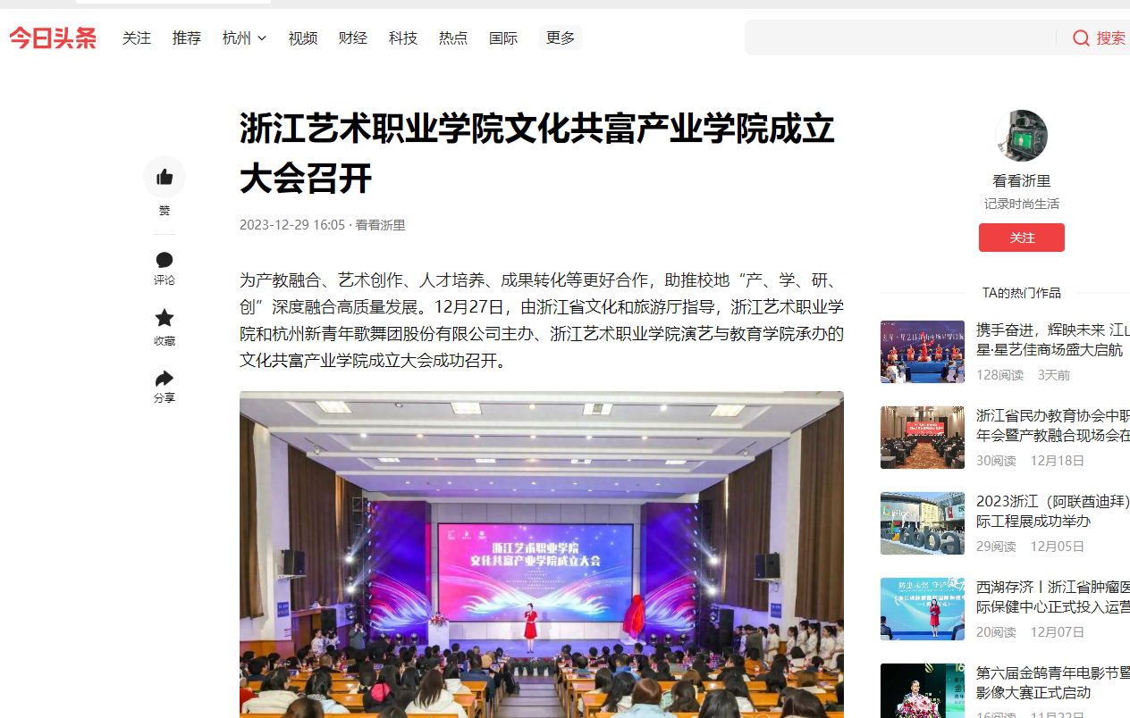 浙江省文化和旅游厅相关部门负责人,宁波市奉化区人民政府、宁波市奉化区文化和广电旅游体育局、宁波市奉化区文化和旅游集团、宁波市奉化区文化馆、杭州市萧山区戴村镇人民政府、杭州新青年歌舞团股份有限公司等单位领导、产业学院共建单位代表、浙江省舞台艺术“1111”人才代表和学校党委班子成员、中层干部、师生代表齐聚一堂,共同见证学校高质量发展迈上新台阶。