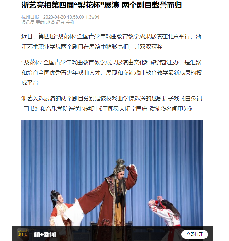 杭州日报:浙艺亮相第四届“梨花杯”展演 两个剧目载誉而归