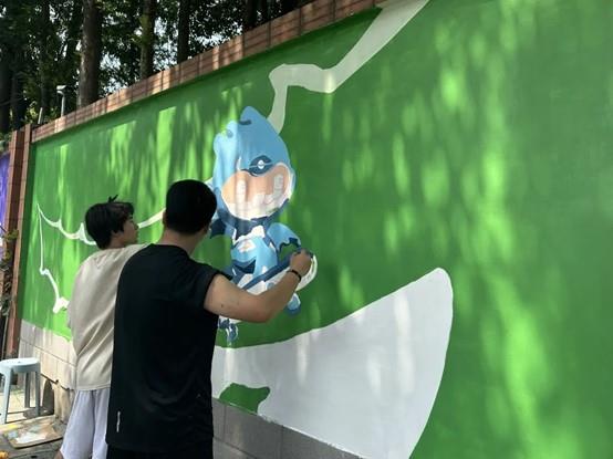 为深入学习贯彻习近平新时代中国特色社会主义思想主题教育,充分发挥高校与社区的合作效能,进一步深化落实党建共建机制,依托专业优势赋能亚运、添彩亚运,6月13日-6月16日,设计学院与滨文社区联合开展“一起来涂‘亚’”墙绘活动。设计学院学生党支部、舞台艺术设计与制作专业师生参加。