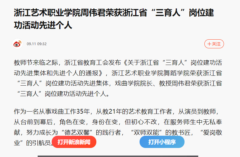 教师节来临之际,浙江省教育工会发布《关于浙江省“三育人”岗位建功活动先进集体和先进个人的通报》,我校舞蹈学院荣获浙江省“三育人”岗位建功活动先进集体,戏曲学院院长、教授周伟君荣获浙江省“三育人”岗位建功活动先进个人。
