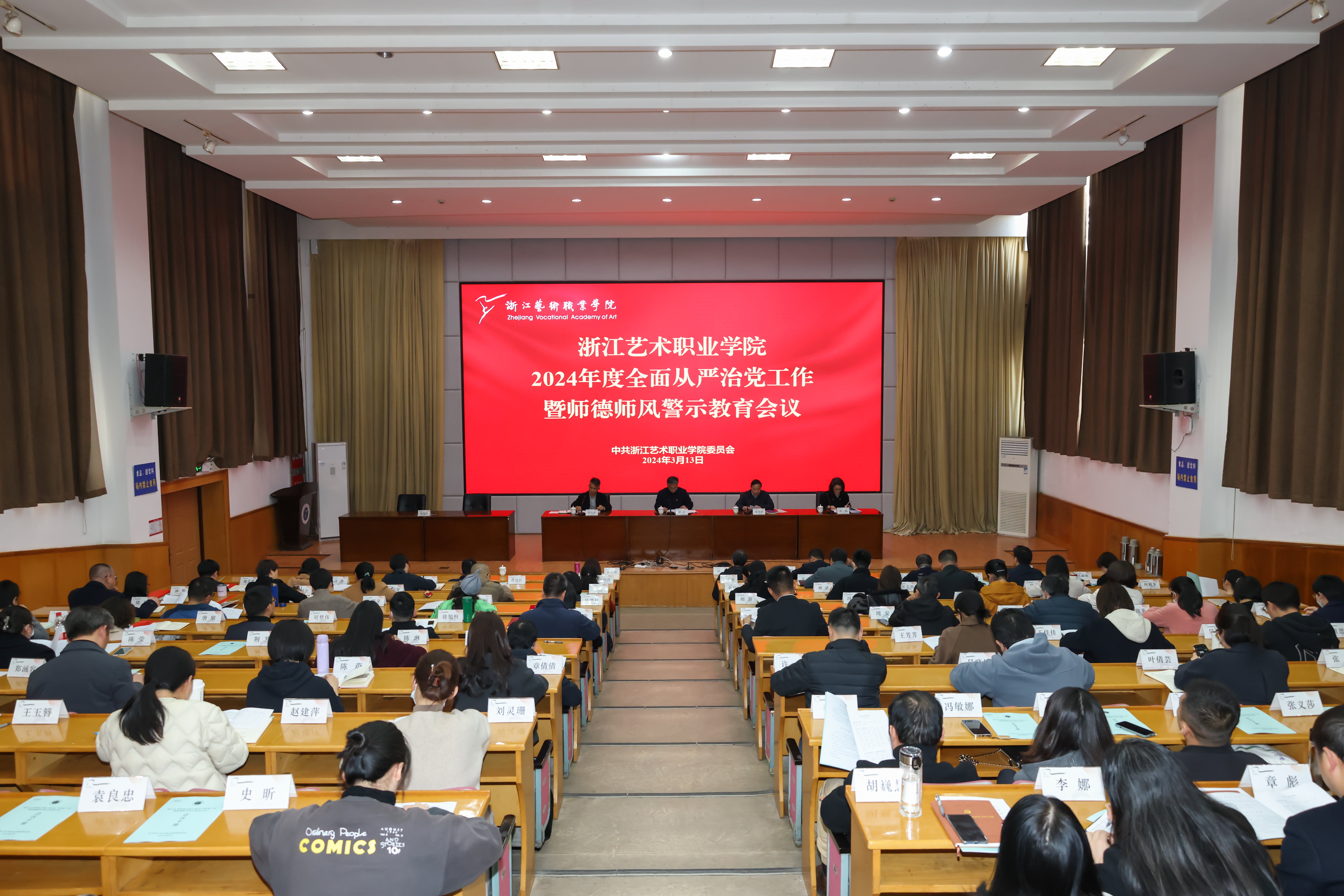沈军甫作党风廉政建设工作报告,用“三个坚定不移”总结了2023年学校党风廉政建设取得的成效,同时指出2024年学校要聚焦四项重点工作:一是聚焦政治监督,持续强化责任落实;二是聚焦作风建设,持续强化师德师风督导;三是聚焦系统施治,持续提高监督效能;四是聚焦“勤廉小单元”培育创建,持续推进勤廉浙艺建设。