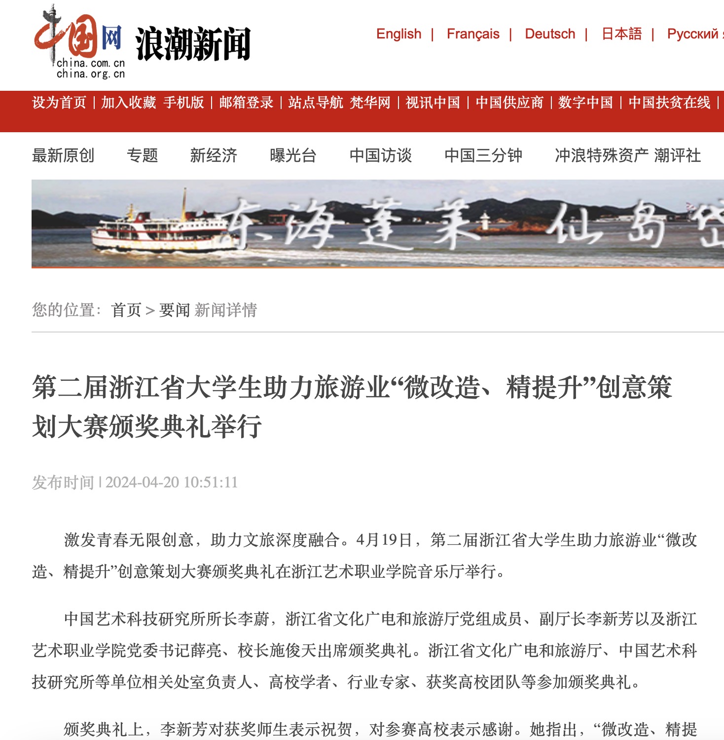 中国网:第二届浙江省大学生助力旅游业“微改造、精提升”创意策划大赛颁奖典礼举行