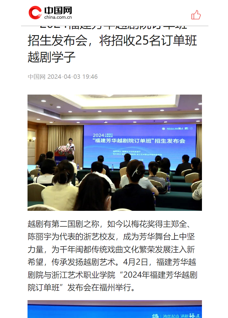 中国网:“2024福建芳华越剧院订单班”招生发布会,将招收25名订单班越剧学子
