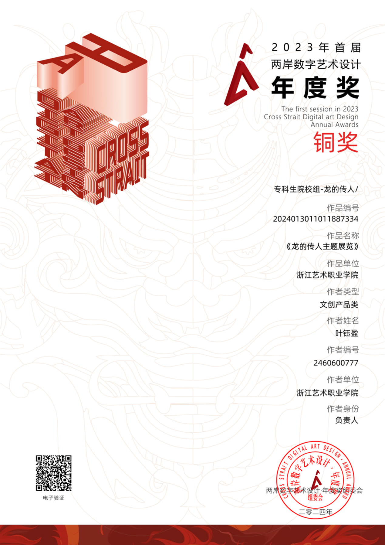 近日,由海峡两岸交流促进会、台湾旅游和文化协会牵头,台湾国际文化创意产业发展协会、高教创赛云竞赛服务平台及两岸文创单位和多所大学协办的2023首届两岸数字艺术设计·年度奖获奖结果公布。本届赛事共征集到来自全国各地的命题赛道“龙的传人”及非命题赛道共计41531项参赛作品,参赛总人数达8.7万人,参赛院校及单位共1521所。设计学院动漫设计专业专业带头人孙煜珑指导的2022级动漫设计专业陈紫妮、叶钰盈、董婧瑶、冯瑶同学的作品《阳明故里》荣获银奖,叶钰盈、陈紫妮、董婧瑶同学的作品《龙的传人主题展览》荣获铜奖。